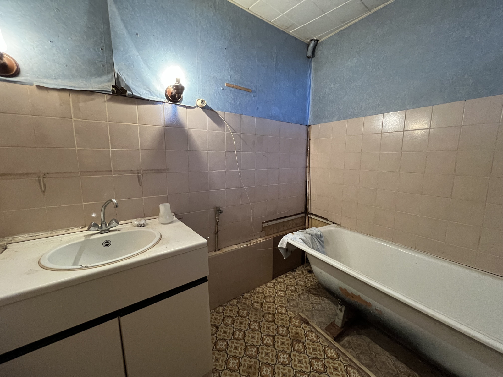 Une maison ancienne, a restaurer, avec un petit extérieur.